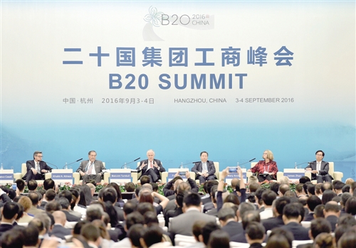 9月4日,澳大利亞總理特恩布爾(左三)在研討會上發言。當日,二十國集團工商峰會在浙江杭州舉辦“實現強勁的國際貿易和投資”專題研討。 新華社記者 李 鑫攝
