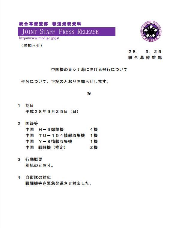 根據日本防衛省統合幕僚監部9月25日當天發布的公告顯示,25日當天共有8架中國軍機出現在東海空域。8架軍機分別為4架H-6戰略轟炸機、1架TU-154電子偵察機、1架Y-8偵察機。另外2架軍機據推斷可能是中國空軍戰機。