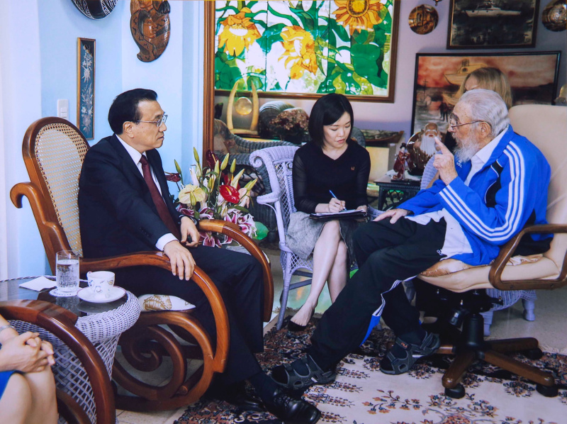 在卡斯特羅位于哈瓦那的家中,李克強與菲德爾·卡斯特羅交流用時近兩小時。