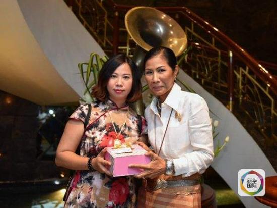 泰國(guó)旅游和體育部部長(zhǎng)科甘(右)向?yàn)橹袊?guó)游客捐獻(xiàn)“熊貓血”的南京導(dǎo)游楊莉贈(zèng)送紀(jì)念品。(新華社記者李芒茫攝)
