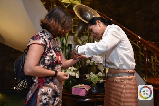 科甘(右)為楊莉佩戴象征泰國(guó)國(guó)旗三色的手鏈。(新華社記者李芒茫攝)