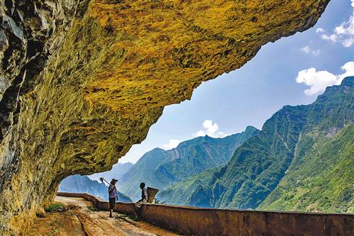 這條路,如一條腰帶,鑲嵌在老虎嘴崖壁上,不僅險象環(huán)生,時常有石塊砸落,在雨天時更是泥濘難行,當(dāng)?shù)厝朔Q之為“天路”。