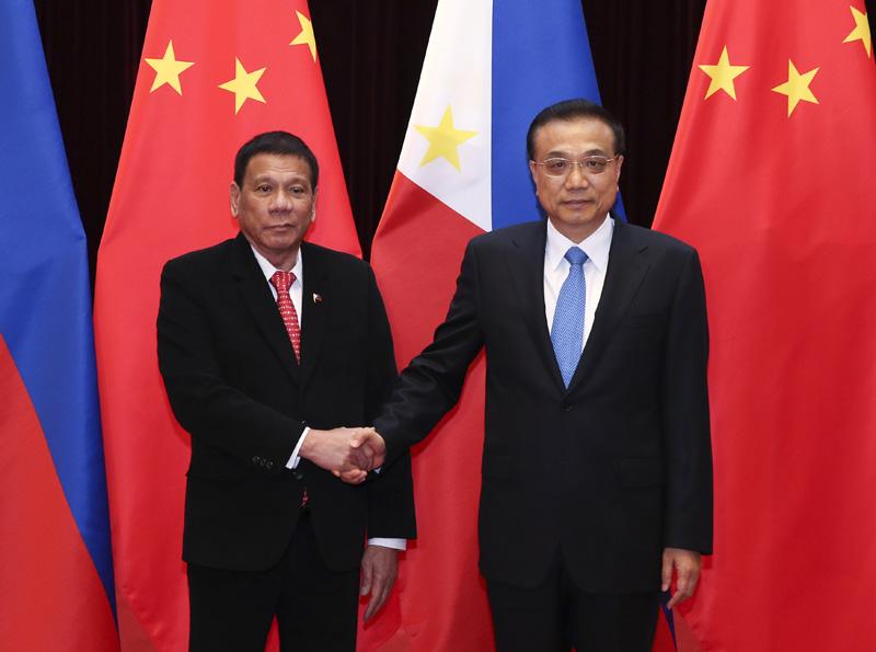 李克強表示,中菲是一衣帶水的鄰邦,有著長期友好交往的歷史。今天上午,習近平主席同你舉行了富有成果的會談,對今后一個時期兩國關系與合作進行了全面規劃。中方重視發展同菲律賓的關系,愿同菲方共同努力,相向而行,加強各領域交往與合作,推動中菲關系回到正常發展軌道,切實造福兩國人民。