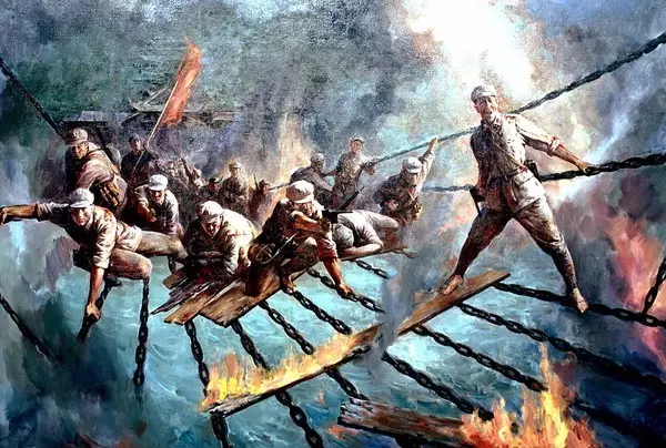 22名戰(zhàn)士踩著13根鐵索,如神兵天降,突破了大渡河天險(xiǎn);