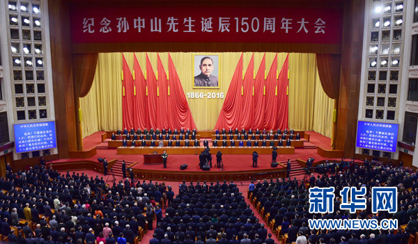 11月11日,紀念孫中山先生誕辰150周年大會在北京人民大會堂隆重舉行。新華社記者 張鐸 攝
