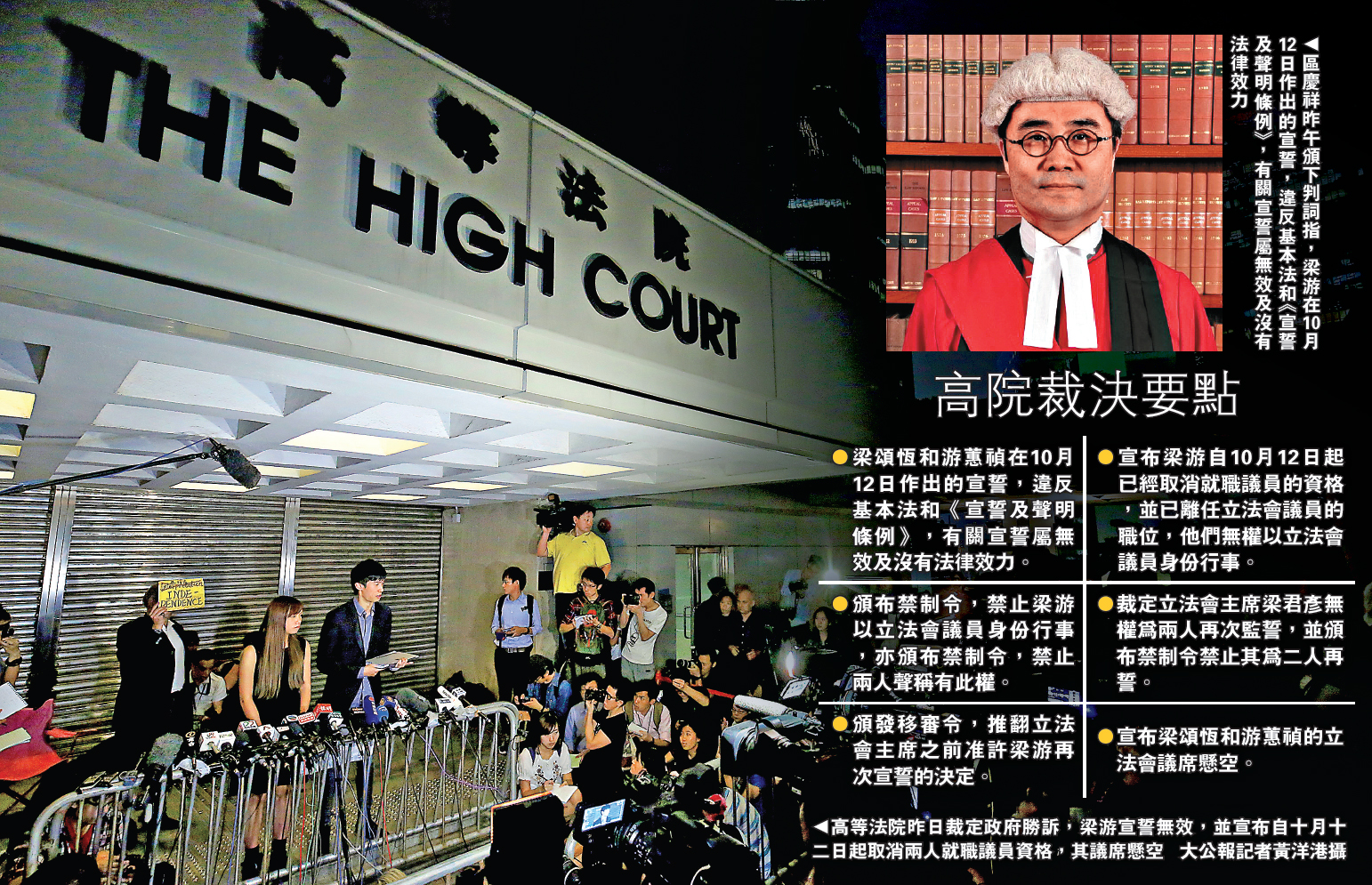 香港高等法院昨日裁定政府勝訴,梁游宣誓無效,并宣布自十月十二日起取消兩人就職議員資格,其議席懸空。