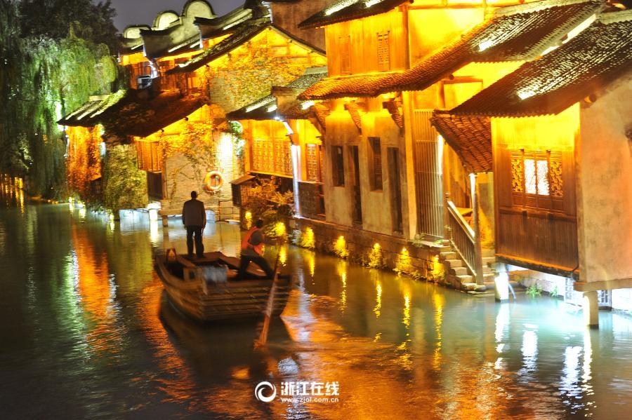 11月15日晚上,水鄉烏鎮燈光璀璨,舟行碧波上,人在畫中游。第三屆世界互聯網大會將于11月16日在烏鎮開幕。浙江在線 記者吳元峰 攝 圖片來源:浙江在線