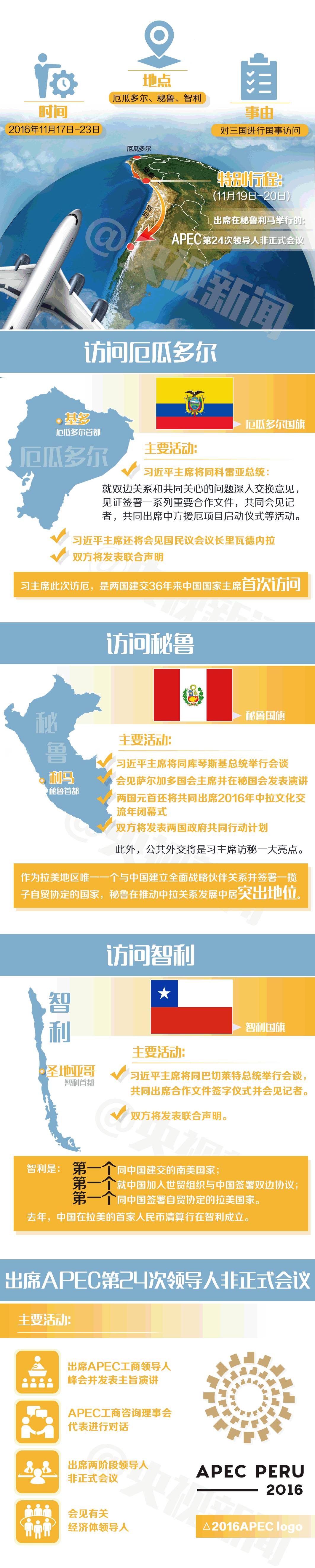 11月16日,國(guó)家主席習(xí)近平乘專(zhuān)機(jī)離開(kāi)北京,對(duì)厄瓜多爾、秘魯、智利進(jìn)行國(guó)事訪問(wèn)并出席在秘魯利馬舉行的亞太經(jīng)合組織第二十四次領(lǐng)導(dǎo)人非正式會(huì)議。這是習(xí)主席第三次訪問(wèn)拉美國(guó)家。