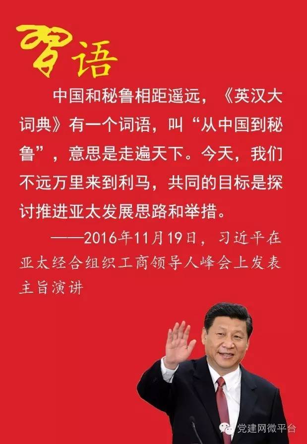 ——2016年11月19日,習近平在秘魯利馬出席亞太經合組織工商領導人峰會并發表題為《深化伙伴關系 增強發展動力》的主旨演講