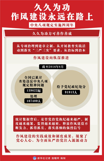 遏制“舌尖上的浪費”、剎住“車輪上的腐敗”、整治“會所里的歪風”……中央八項規定實施4年來,黨風政風、社風民風發生了一系列實實在在的改變。截至2016年8月31日,全國累計查處違反八項規定精神問題139622起,處理187409人,給予黨紀政紀處分91913人。從查出違紀問題類型來看,其中“違規配備和使用公車”26172起,“違規發放津補貼或福利”13826起,“大辦婚喪喜慶”12934起,“違規收送禮品禮金”11015起,“違規公款吃喝”9978起,“公款國內旅游”4861起,“樓堂館所違規”1520起,“公款出國旅游”578起。