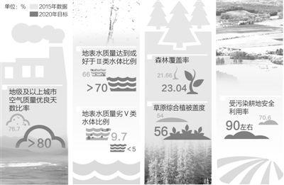 規劃提出約束性和預期性指標,其中約束性指標12項,分別是地級及以上城市空氣質量優良天數比率、細顆粒物未達標地級及以上城市濃度下降、地表水質量達到或好于Ⅲ類水體比例、地表水質量劣Ⅴ類水體比例、森林覆蓋率、森林蓄積量、受污染耕地安全利用率、污染地塊安全利用率,以及化學需氧量、氨氮、二氧化硫、氮氧化物污染物排放總量減少。