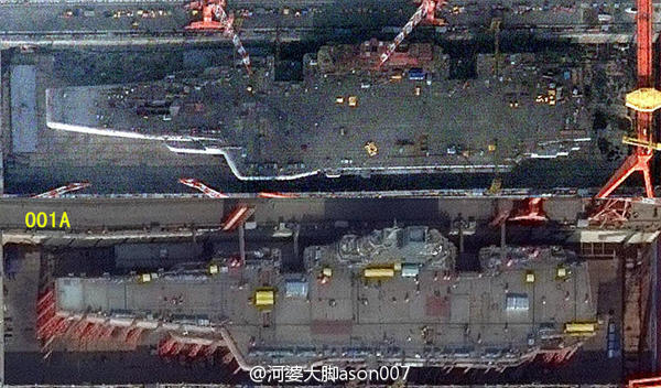 日前,網上傳出中國國產001A航母近期衛星照,顯示該航母已經建成,輪廓分明。(鳴謝:網友河婆大腳ason007)