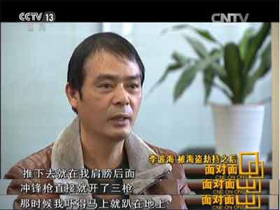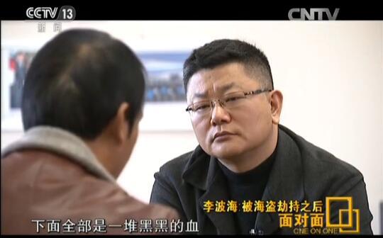 李波海:從機器縫里面看去,海盜穿著短褲,皮膚全部都是黑的,手里拿著沖鋒槍,嚇都嚇死了,還會出來,后來在機艙里,躲了差不多有二十多分鐘,有一個柬埔寨的船員叫我們,他說叫我們?nèi)慷忌先?上去駕駛艙,索馬里海盜講話,叫我們?nèi)可先?我們才一個一個出來,到船長駕駛艙里面,那時候看到駕駛艙墻壁上面,全部都是血。