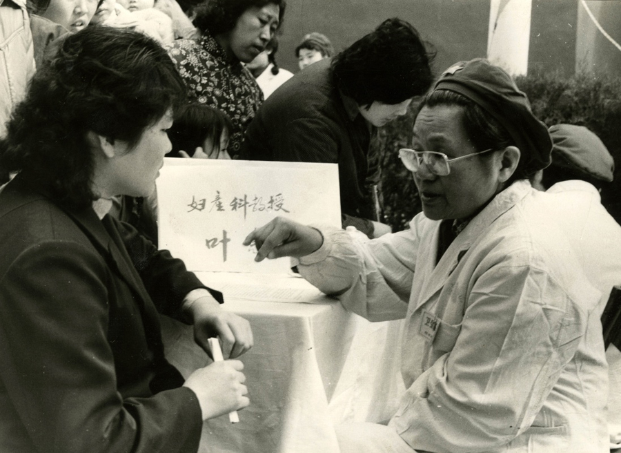 1980年義診時,葉惠方教授(右)為就診者講解(資料照片)。新華社發