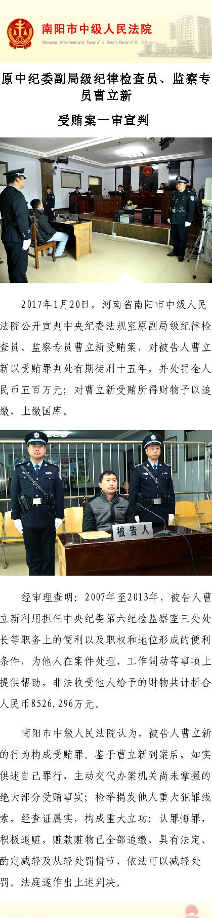 據(jù)南陽(yáng)市中級(jí)人民法院官方微博消息,2017年1月20日,河南省南陽(yáng)市中級(jí)人民法院公開(kāi)宣判中央紀(jì)委法規(guī)室原副局級(jí)紀(jì)律檢查員、監(jiān)察專員曹立新受賄案,對(duì)被告人曹立新以受賄罪判處有期徒刑十五年,并處罰金人民幣五百萬(wàn)元;對(duì)曹立新受賄所得財(cái)物予以追繳,上繳國(guó)庫(kù)。