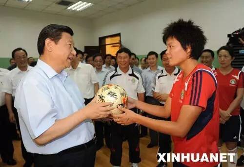 2008年7月,習近平實地考察北京奧運會足球比賽秦皇島賽區籌辦工作。中國女足隊員李潔向習近平贈送隊員簽名的足球。