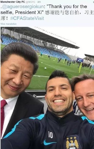 2015年10月,習近平訪問英超曼城俱樂部,同卡梅倫首相、曼城球星阿圭羅一起自拍。