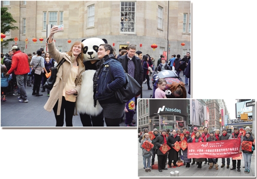 下圖 近年來(lái),中國(guó)春節(jié)正被越來(lái)越多的美國(guó)民眾接受,多地舉辦系列活動(dòng)慶祝這一傳統(tǒng)節(jié)日。圖為中美兩國(guó)藝術(shù)家在紐約時(shí)代廣場(chǎng)共同展示中國(guó)“福”字。 經(jīng)濟(jì)日?qǐng)?bào)記者 朱 旌攝
