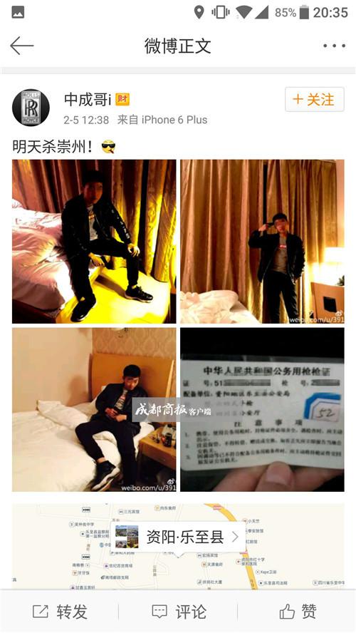 6日,該微博已被發(fā)布者“中成哥i”刪除。但根據(jù)報料者截圖,“明天殺崇州!”的微博發(fā)布于2月5日12時38分,微博發(fā)布時的定位為資陽市樂至縣公園路附近。4張配圖中,有3張同一小伙在賓館內(nèi)持槍的圖片,另有1張圖片為“中華人民共和國公務(wù)用槍槍證”,上面能清晰地看出證號、槍號、配備單位、槍型和發(fā)證機(jī)關(guān)!爸腥A人民共和國公務(wù)用槍槍證”顯示,槍支配備單位為資陽地區(qū)樂至縣公安局,槍型為六四式手槍,發(fā)證機(jī)關(guān)為四川省公安廳。