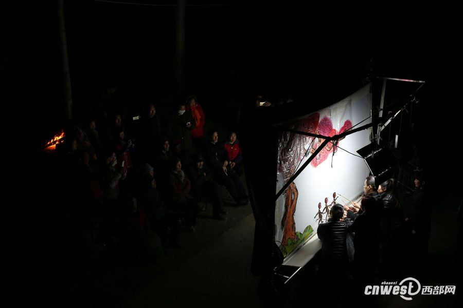 西部網(wǎng)訊(記者 魏永賢)渭南市華州區(qū)櫻桃溝村,夜幕降臨,村里的老鄉(xiāng)們匯聚到皮影戲臺前觀看皮影戲,冬夜室外寒冷,老鄉(xiāng)們的身后生起了火御寒!澳憧,喜兒的芭蕾跳得多好呀,比真人都好!币幻贻p的媳婦興奮地說。