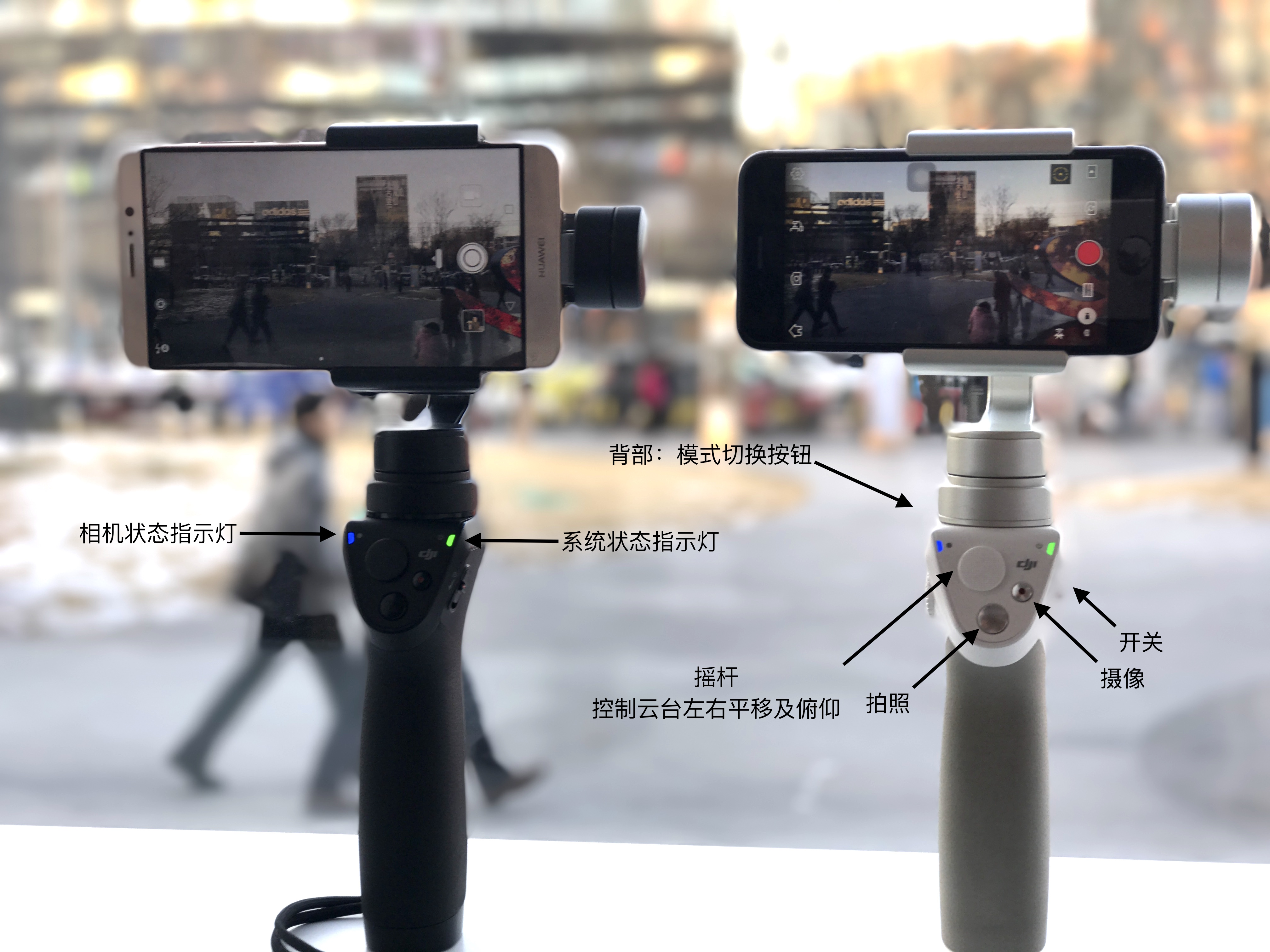 上圖是Osmo,它自帶相機,在三軸云臺的作用下可以拍出穩定的視頻及照片,手機是用來連接“DJI GO”app并接收圖傳畫面。Osmo Mobile沒有鏡頭,它是一個輔助設備,簡單說可以幫助手機拍出更為穩定的視頻及照片,而這些視頻及照片的質量完全依靠加載的手機。