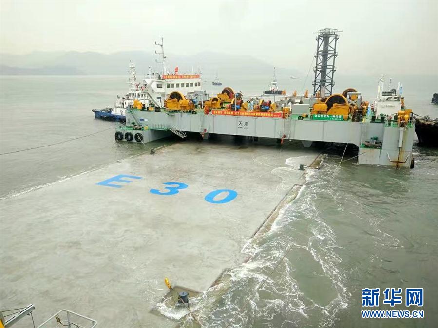 施工方將最后一節(jié)沉管運至指定區(qū)域(3月6日攝)。3月7日,港珠澳大橋海底隧道最后一節(jié)巨型沉管——E30管節(jié)安裝成功,軸線、縱坡、艏艉高差等各項關(guān)鍵指標均滿足設(shè)計標準。至此,體量超大的33節(jié)沉管全部安裝完畢,港珠澳大橋已建隧道總長5652米,距最終合龍僅差12米。新華社記者周強攝
