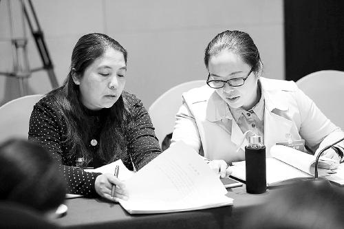 資艷萍代表(左)與鄧瑞代表查看會議資料。本報記者張哲/攝
