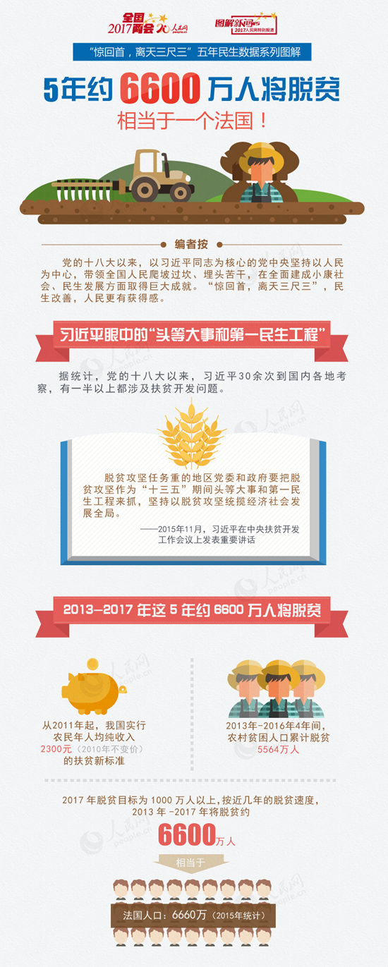 2013-2017年,這5年我國(guó)約6600萬(wàn)人將要脫貧。貧困發(fā)生率從10.2%下降到4.5%。“原來(lái)靠吃野菜填肚子,現(xiàn)在頓頓都有油水!”“去年,家里各種收入有7萬(wàn)多塊錢(qián),人均差不多8000多塊。”“今年手頭寬松了!”“看來(lái)今年過(guò)了個(gè)‘肥年’!”……
