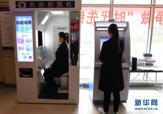 2017年3月8日,市民在重慶兩江新區人和派出所使用身份證自助拍照機和自助申領機。 重慶市兩江新區公安分局推出的這項“互聯網+”便民措施可全天候24小時辦理身份證到期換領、丟失補領等業務,全程僅需約3分鐘。新華社記者王全超攝