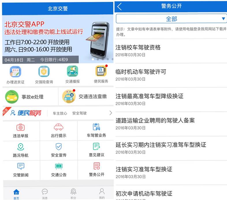 這是北京公安局推出的“北京交警”APP截圖,用戶可在首頁方便查詢業務辦理情況以及警務公開信息。