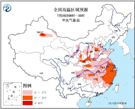 中新網7月20日電 據中央氣象臺官網消息,中央氣象臺7月20日06時繼續發布高溫黃色預警:預計,7月20日白天,西北地區東部、華北中南部、黃淮大部、江淮、江漢、江南以及重慶等地有35℃以上的高溫天氣,其中,河北西南部、山西西南部、陜西關中地區、湖北西部、重慶北部、湖南北部、安徽東部、江蘇南部、江西東部、浙江、福建中北部等地的部分地區最高氣溫可達37~39℃,局地可超過40℃。
