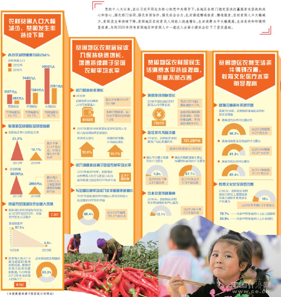 黨的十八大以來,在以習近平同志為核心的黨中央領導下,各地區各部門抱定堅決打贏脫貧攻堅戰的決心和信心,強化部門協同、強化東西協作、強化社會合力,扎實推進精準扶貧、精準脫貧,農村貧困人口大幅減少,貧困發生率持續下降,貧困地區農村居民人均收入快速增長,生活消費水平大幅提高,生活條件和環境明顯改善,為到2020年所有貧困地區和貧困人口一道邁入全面小康社會打下了堅實基礎。(數據來源于國家統計局網站)