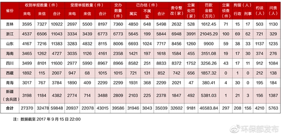 截至2017年9月15日,督察組交辦的環境舉報,地方已辦結35039件,辦結率達到88.5%。其中,責令整改32602家;立案處罰9181家,罰款46583.84萬元;立案偵查297件,行政和刑事拘留364人;約談4210人,問責5763人。