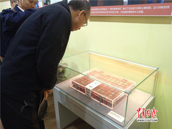 在第三展區,天津市濱海新區行政審批局辦事大廳封存的109枚審批公章吸引了許多參觀者的駐足。據工作人員介紹,2014年5月20日,天津市濱海新區行政審批局掛牌成立,原來分散在18個不同部門的216項審批職責歸并到了1個部門,1枚公章取代了109枚公章,“這109枚公章真實見證了政府簡政放權的過程。”