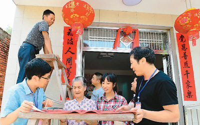 圖為9月21日,在福建省寧德市古田縣鳳埔鄉(xiāng)造福工程集中安置點(diǎn),鄉(xiāng)干部黃東華(左一)和喜遷新居的林光鍋一家共同貼上喜慶的門聯(lián)。