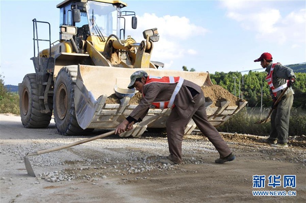 工人在云南省會澤縣駕車鄉的鄉村公路施工現場忙碌(10月20日攝)。(新華社記者 白靖利 攝)