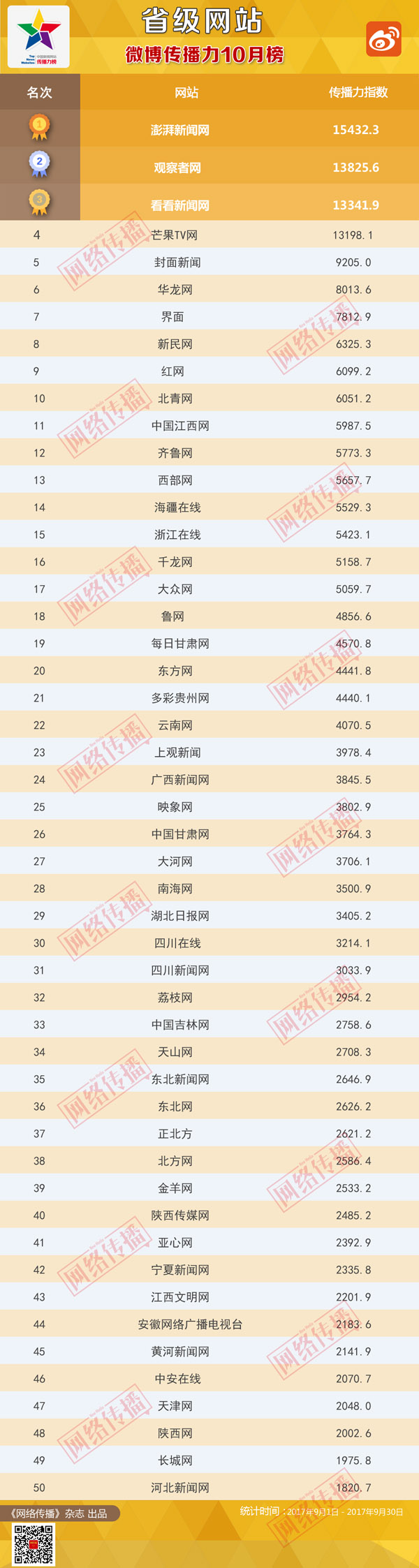 省級(jí)網(wǎng)站傳播力2017年10月榜發(fā)布