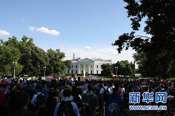 2017年6月1日,在美國首都華盛頓,數百民眾在白宮外參加抗議活動。美國總統特朗普當日在白宮宣布,美國將退出應對全球氣候變化的《巴黎協定》。新華社記者 顏亮 攝