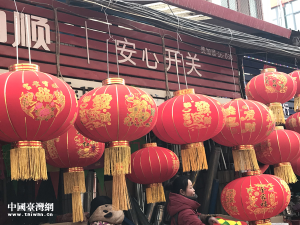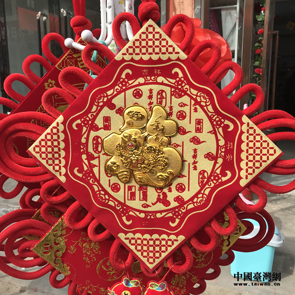 2月14日,邯鄲市永年區茹佐村年貨市場上待售賣的“福”字。(中國臺灣網 張亞靜 攝)