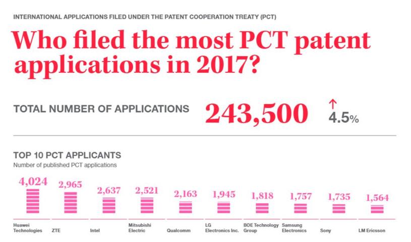 華為和中興兩家中國企業雄踞專利申請榜前兩位。圖片來源:世界知識產權組織(WIPO)官網截圖