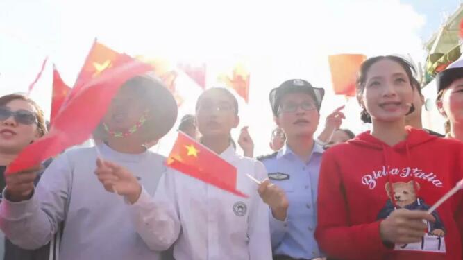 身處祖國最南端的人們,被旋律中高昂的熱情打動(dòng),心底對(duì)國家和民族的歸屬感、認(rèn)同感和自豪感油然而生。他們從碼頭的各個(gè)角落走來,聚在一起,揮舞著鮮艷的五星紅旗,加入演唱。