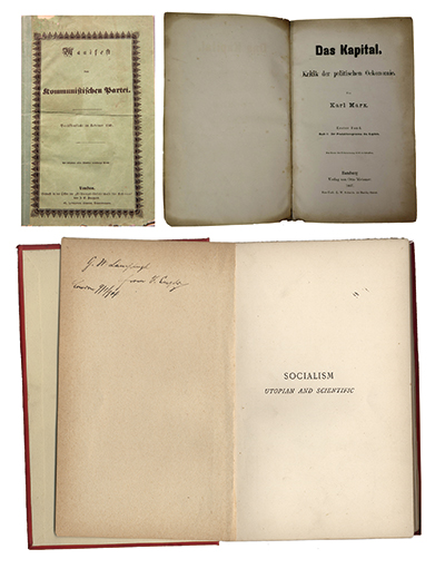 上圖為1848年《共產黨宣言》德文第一版。右上圖為1867年《資本論》德文第1卷第一版。下圖為恩格斯的題字贈書《社會主義從空想到科學的發展》,1892年英文版。 中央黨史和文獻研究院供圖