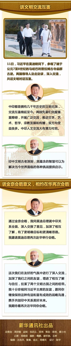 10月11日至12日,在印度金奈,國家主席習近平同印度總理莫迪舉行中印領導人第二次非正式會晤。兩國領導人談了些什么,一起來看看↓↓↓