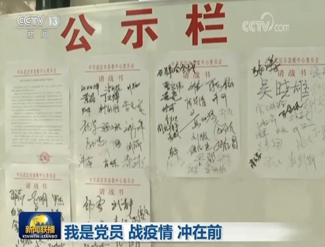 央視網消息(新聞聯播):習近平總書記強調,各級黨組織和廣大黨員干部必須牢記人民利益高于一切,不忘初心、牢記使命,團結帶領廣大人民群眾堅決打贏疫情防控阻擊戰。一個黨員就是一面旗幟,在武漢抗擊疫情的主戰場上, 黨員醫務工作者主動請纓,沖鋒在最前線的身影里,總能看到一位位共產黨員當先鋒、做表率。