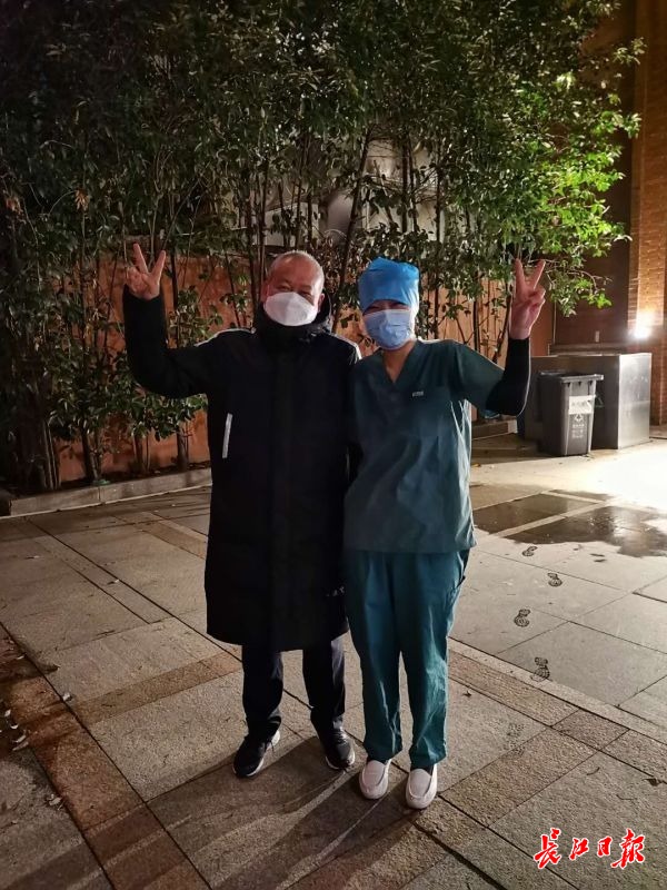 硚口武體方艙醫院,休艙當天,最后出艙的護士和方艙醫院院長彭小祥合影。