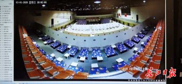 硚口武體方艙醫院休艙當天下午6時,通過監視器里面看到的方艙醫院全景。
