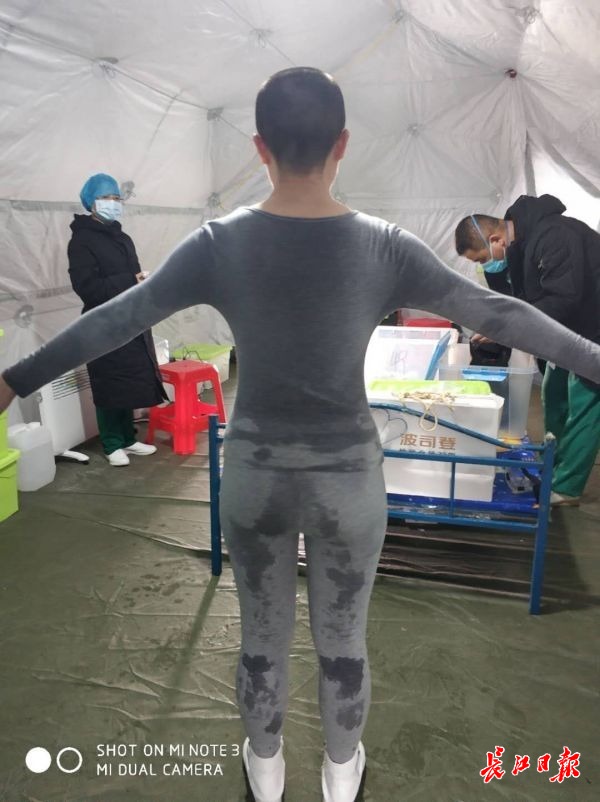 硚口武體方艙醫院,護士出艙前脫掉被污染的防護服和隔離衣,走到用帳篷搭建的清潔區,用酒精進行全身消殺處理。