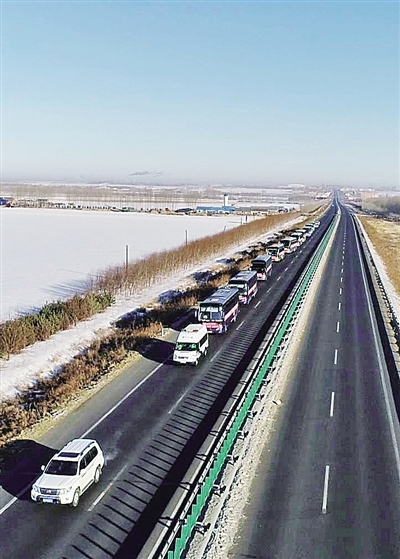 三月十三日,黑龍江省“點對點”輸送務(wù)工人員的大客車行駛在高速公路上。新華社發(fā)(李志強攝)