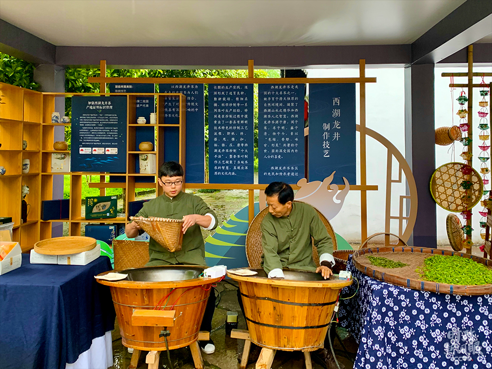 △西湖龍井以“色綠、香郁、味甘、形美”著稱于世,這是制作技藝展示區(qū)。(總臺(tái)央視記者段德文拍攝)