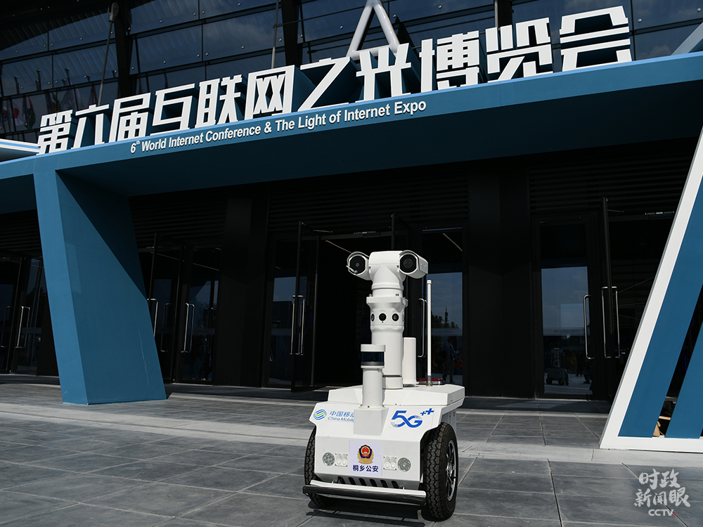 △這是“互聯(lián)網(wǎng)之光”博覽會(huì)展館前的5G警用機(jī)器人。